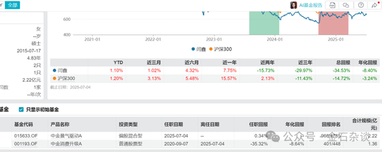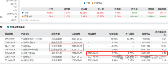 不过,正如金石杂谈此前分析,丁杨近1年业绩很好,收益率高达25%,但近三年亏损4.56%。他曾经管理的中金瑞和24年10月成立,存续3个月就因为规模不足5000万而仓促清盘;而且卸任的中金景气驱动,规模长期维持在1000万左右,基民更是只有77名,卸任前公司吸引帮忙资金支持才有了目前超2亿的规模。