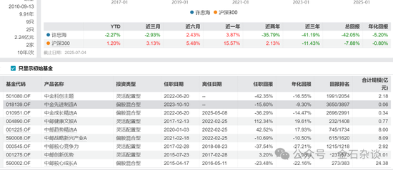 7)公司基金经理许忠海业绩惨烈,近三年巨亏41%,完全踏空了节奏,22年管理规模超20亿,如今规模只有2.24亿。就在2025年5月8日,他卸任了中金成长精选,如今管理产品只剩下2只了。