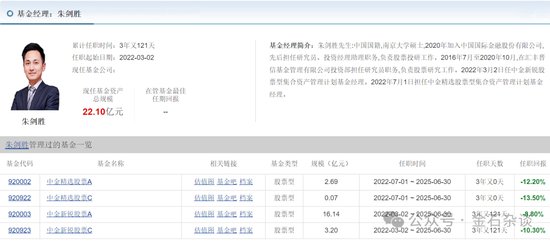 6)此外,在主动权益中,基金经理朱剑胜管理规模22亿,占据中金基金权益规模的1/4,但管理基金任职亏损全部为负,且亏损超10%。